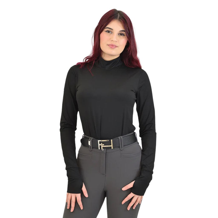 ISA is a mock turtleneck style microfiber sun shirt that can also be used for layering in cool weather. It is made with FH original lightweight, silky microfiber with UV protection and tailored for a flattering fit and all day comfort. The thumbhole sleeve is a must-have for athletic use and to protect hands from the sun. Wear it in white under your show coat for a professional show shirt look!