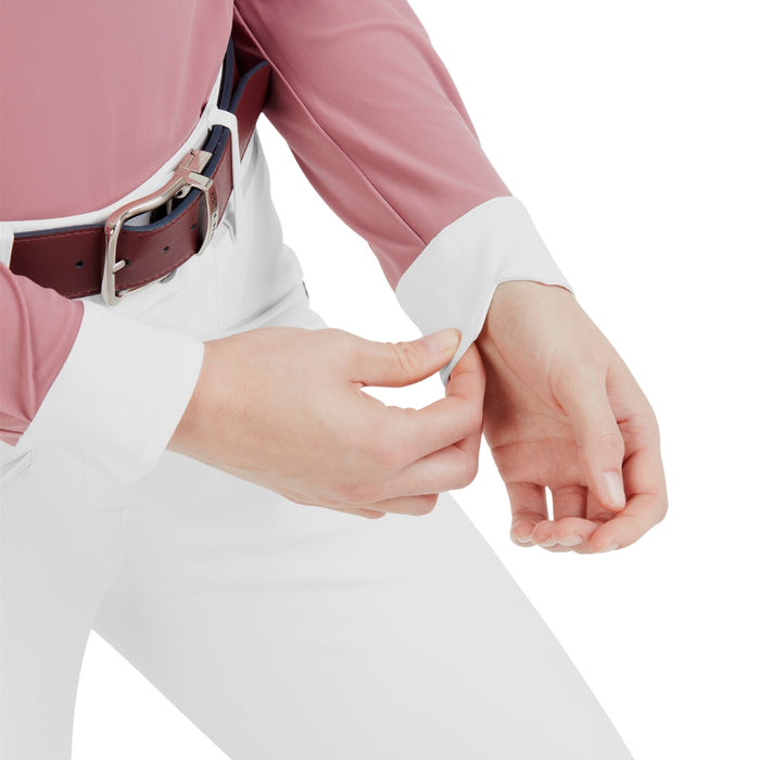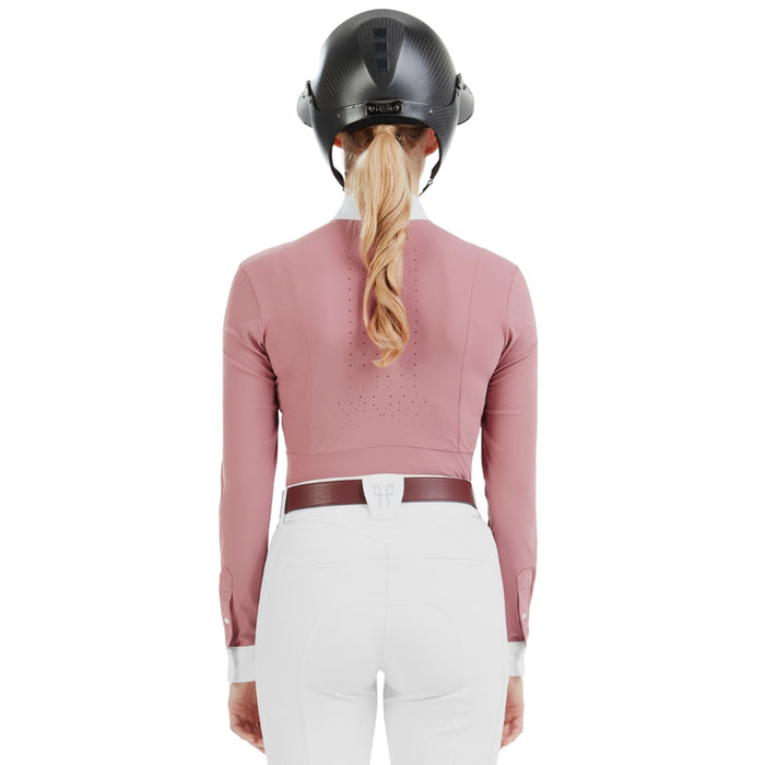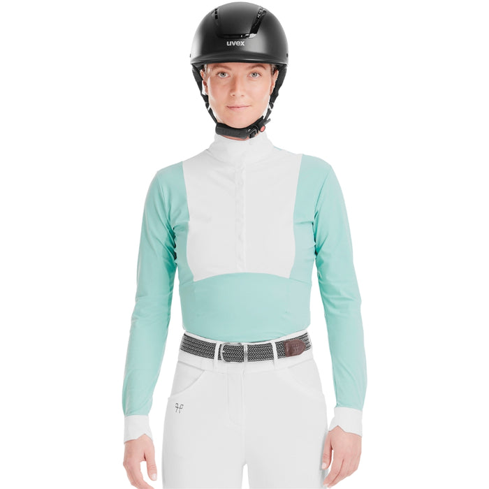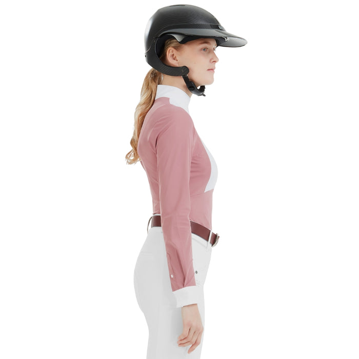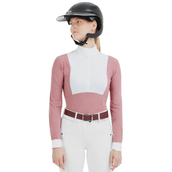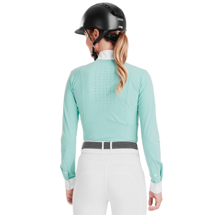 A light and breathable show shirt Its ergonomic shape create a perfect silhouette and allow for great freedom of movement. Thanks to its high collar, the Monica shirt is also suitable for hunter classes.