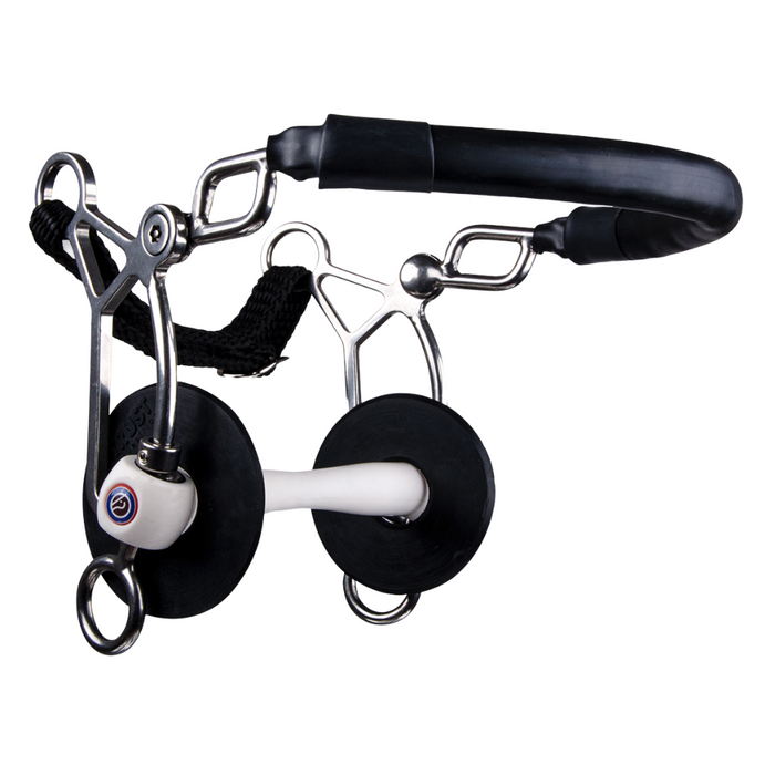 The Hackamore Combi short cheekpiece is a combination of a Hackamore with a bit. The Hackamore Combi distributes the pressure over the mouth and nose. The greater the leverage effect, the bigger the impact. The TRUST Hackamore combinations all have an adjustable screw above the mouthpiece. The lower the screw, the more pressure on the nose. This combination with short shanks has less impact than the long Hackamore Combi. The curb strap should be properly adjusted (not loose, not too tight but just right), so that the nosepiece is well-fitted and stays in place. The cheekpiece is attached to the rectangular part.