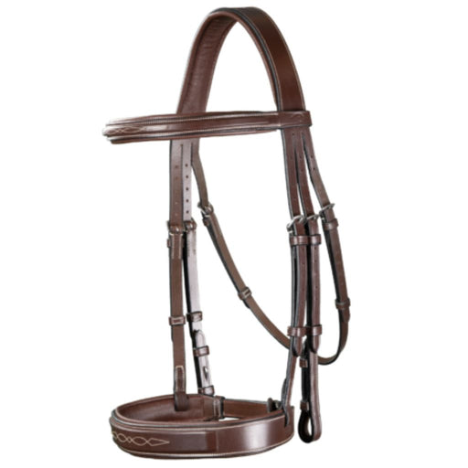 Dy’on 3-strap headpiece, slightly square- raised noseband and browband with cream decorative topstitching and comfort padding browband with hot sta...