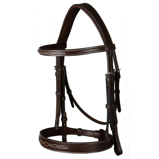 Dyon cavesson noseband bridle in English leather with anatomic headpiece. Cream fancy stitching. Slightly raised and padded cavesson and browband....