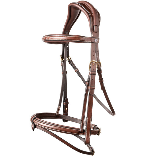 Dyon D Collection Bridle with double noseband. Iconic D collection details, cream stitching and brass hardware. Slightly square- raised 2- in-1 sna...