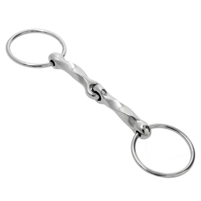 The Slow Twisted Irish Snaffle has a twisted single-jointed mouthpiece with a ‘nutcracker’ action that creates a very severe, sharp effect on the sides of the bars and tongue. Careful consideration before use of a twisted, single-jointed bit is recommended.