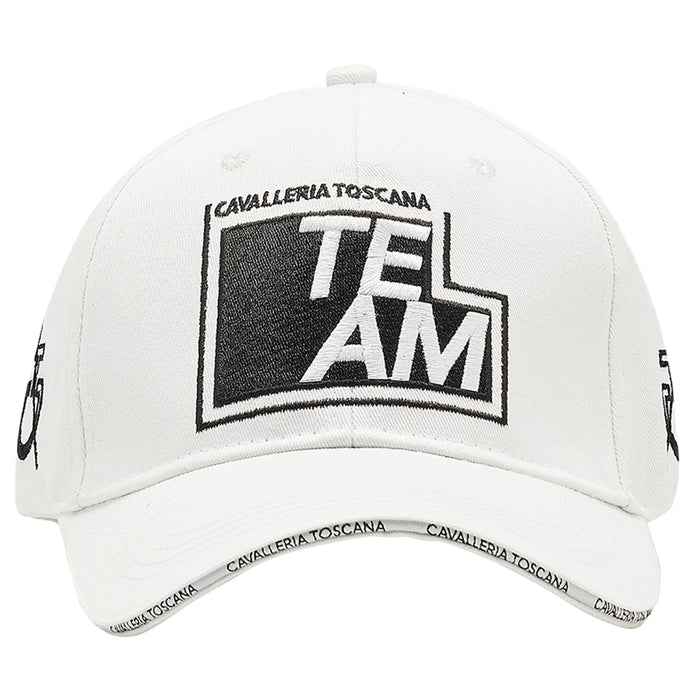 Cavalleria Toscana reinterprets a classic of sportswear to offer a distinctive accessory that completes your horseback riding. This baseball hat is made of pure breathable cotton with a custom visor that protects the eyes from the sun's rays and a strap on the back to adjust the fit. Rich in graphic references to the brand's aesthetics, it features a maxi Cavalleria Toscana Team embroidery in the center.