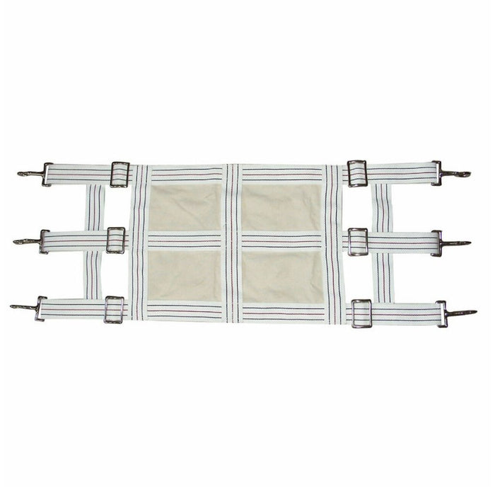 Stall guard closed up in the middle with strong canvas to help alleviate risk of getting legs caught while pawing. Adjustable to 48".