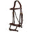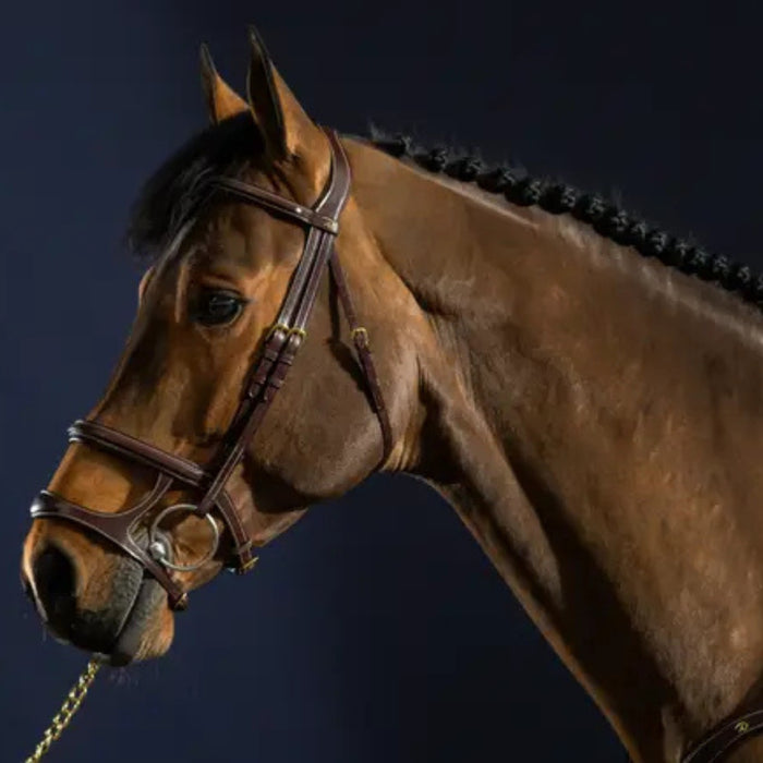 Dyon D Collection Bridle with double noseband. Iconic D collection details, cream stitching and brass hardware. Slightly square- raised 2- in-1 snaffle and dropped noseband. Depending on the desired effect, the snaffle or dropped version may be used (effect of the dropped noseband without its constraints so as not to press on the corners of the mouth). Buckle of the snaffle noseband mounted on a padded protective leather backing Front part of the dropped noseband made of extra-supple leather.