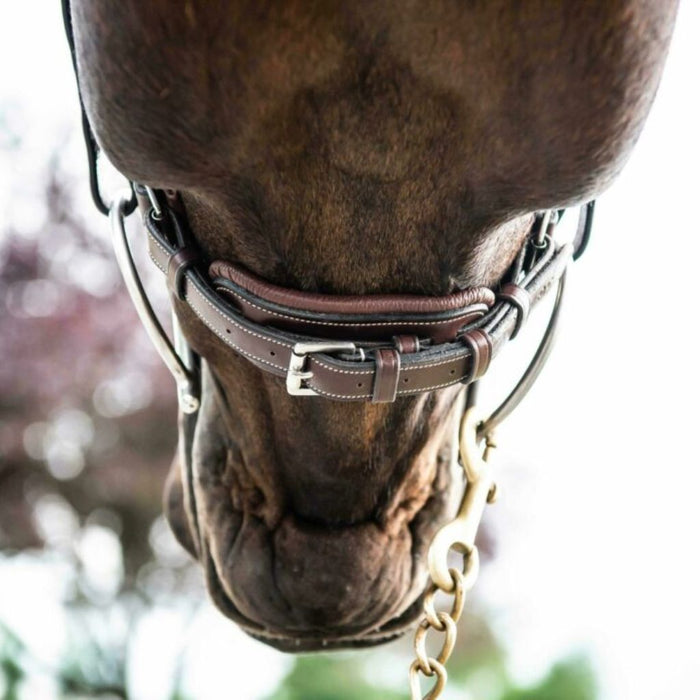 Slightly square-raised wide Hunter Noseband with crank pull back and decorative cream topstitching and padding. Can be fitted to the US Collection bridles with silver hardware.