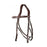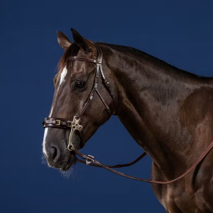 Slightly square-raised browband with decorative topstitching Headpiece has a single cheekpiece for the hackamore Hackamore cheekpieces with adjustable strap under the cheeks to keep them in place