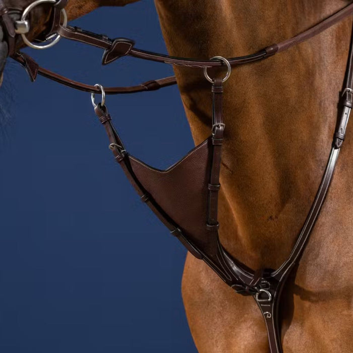 Adjustable full bib martingale made of soft Dy’on leather. Attaches to a yoke or breastplate by means of a roller buckle.