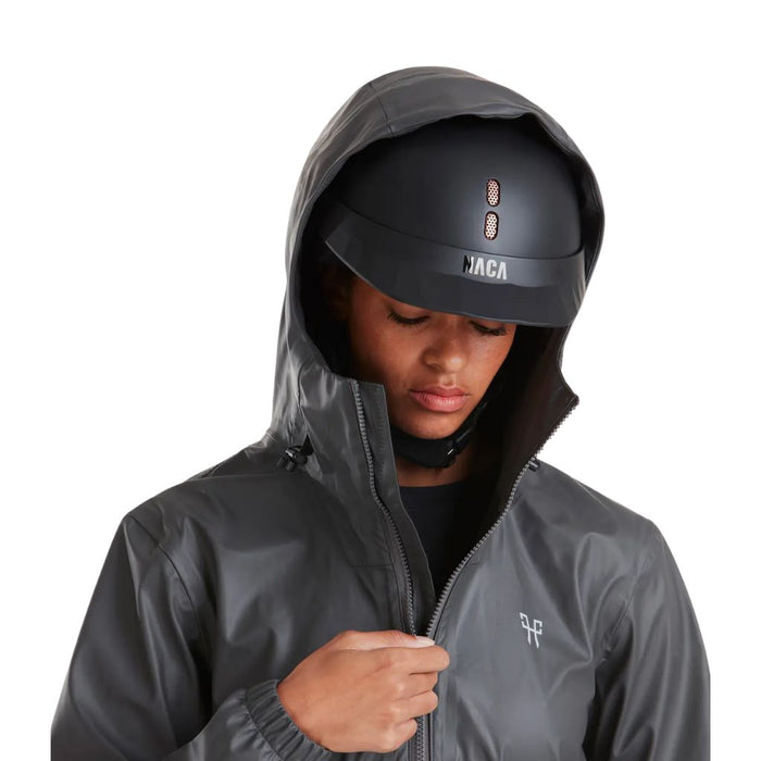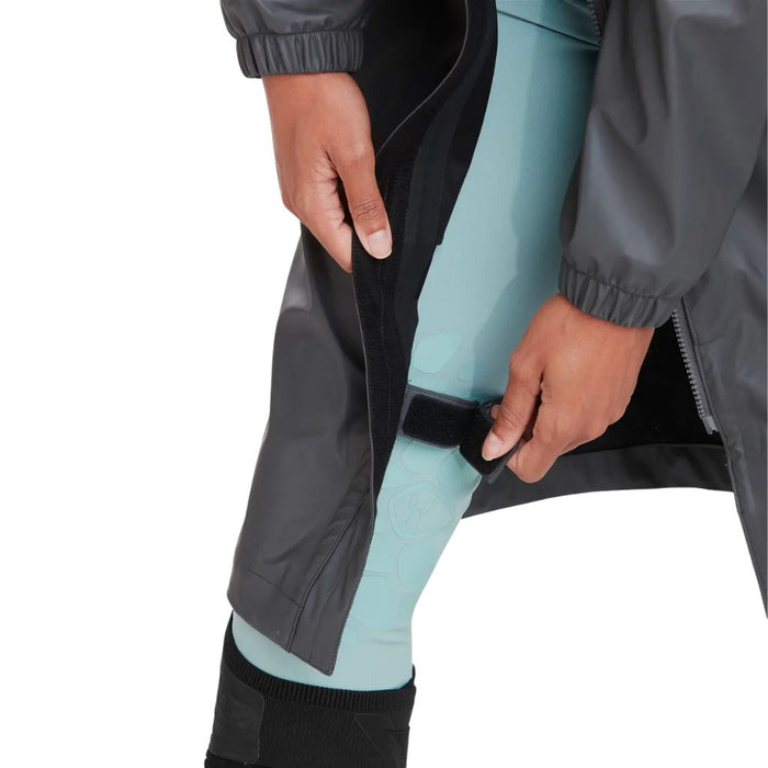 The surface of the material is fully coated, making it highly waterproof and windproof. The structure is supple and stretchy for total freedom of movement when riding. All the seams are waterproofed and the zippers are covered with a protective flap to limit water infiltration, making the jacket even more waterproof. A large opening in the back lets you adjust the shape while riding. The sides of the jacket are fastened around the thighs with elastic straps for added protection. The eco-friendly fabric is OEKO-TEX® Standard 100 certified, and the DWR C0 water-repellent treatment is PFC (fluorocarbon) free.