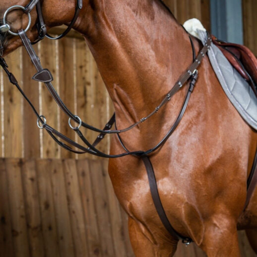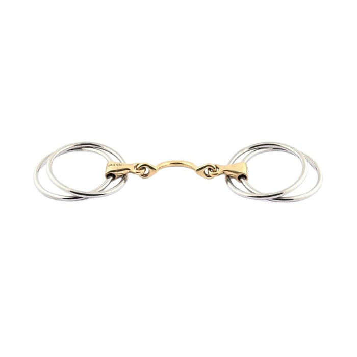 The port combines the full bit and french mouth bit alleviating pressure on the tongue and on the palate. The two loose rings are attached to the cheek pieces and the two mouth piece rings are fixed on the reins.