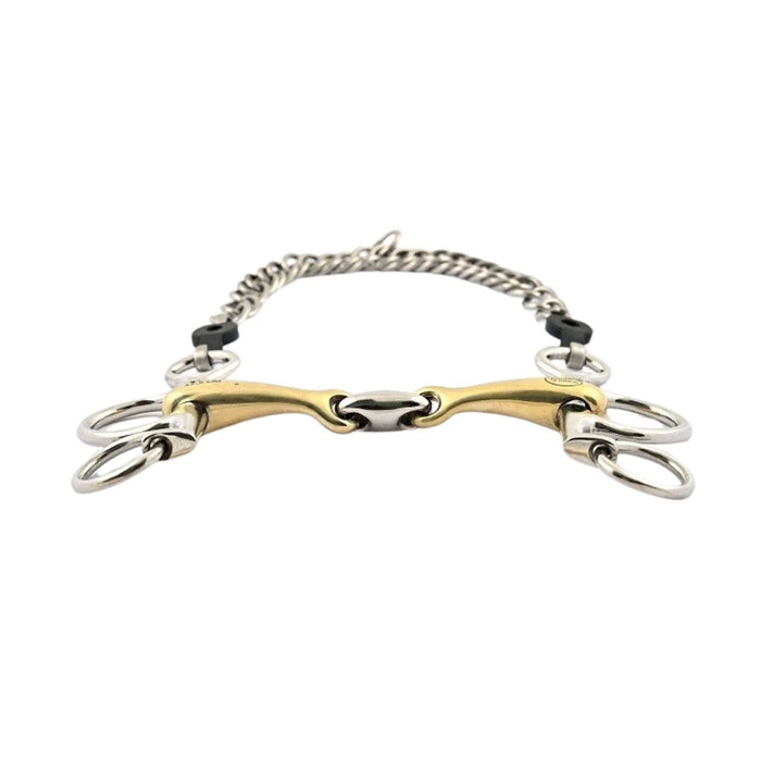 The self-blocking mechanism will make this bit action stronger if the horse takes a too strong contact. Every Pelham bit can be used directly with two reins, with bit roundings or with four reins. Therefore, the curb chain action can be softened by using other curb chain types as leather or nylon ones.