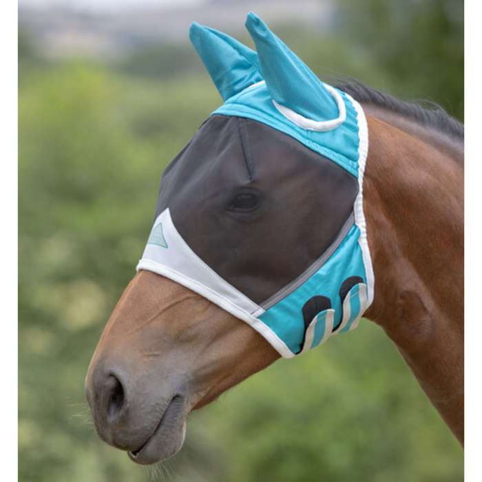 A full face mesh fly veil complete with air stream fabric on the ears provides flexible protection against flies. Ergonomic shaping and fleece padding along the seams keeps the fly mask away from the eyes and reduces gaps. Adjustable touch close safety straps allow for a snug fit. Hand wash cool.