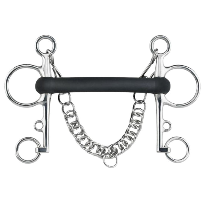 A flexible rubber pelham with stainless steel cable prevents the bit from being bitten through.