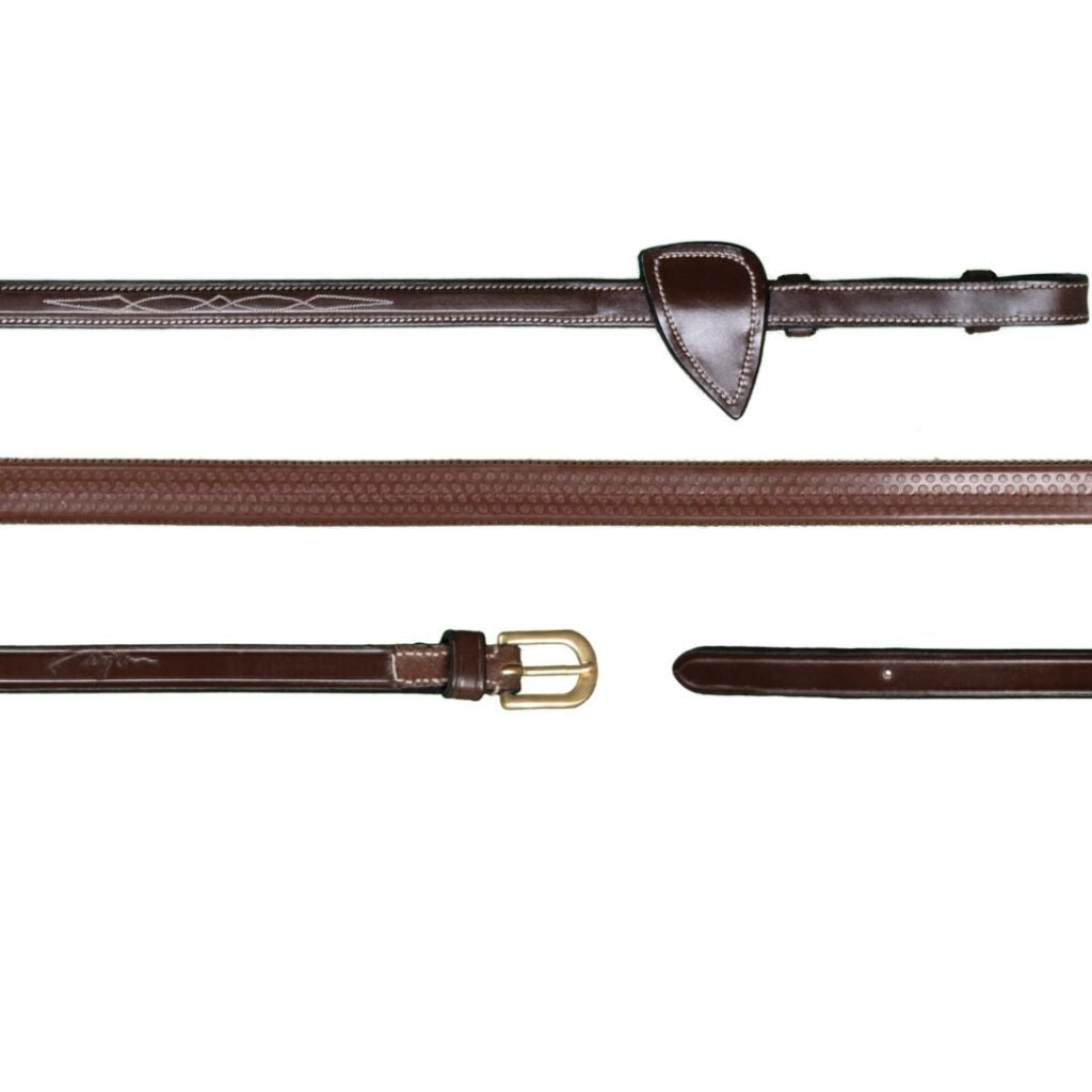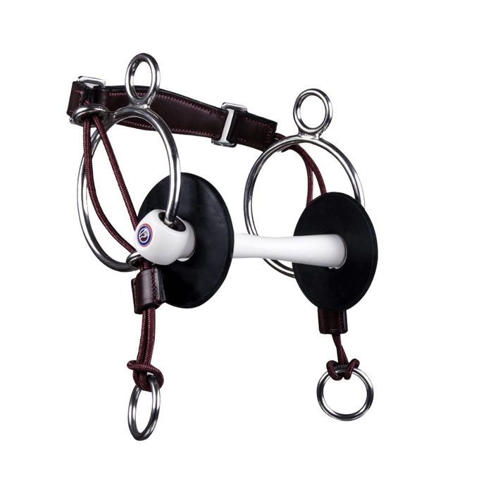 The Curbgag is a combination of the Pelham and the Loose ring Gag. A Curbgag is a loose ring with two small holes on each side for the leather curb strap to run through. The pressure points are on the chin and behind the ears. This cheekpiece can be used with one or two reins. It is most commonly used with two reins, one attached to the large ring and the other to the ring of the leather curb strap. This way, the rider can better control the pressure distribution between the curb and the mouth.