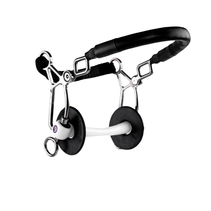 The Hackamore Combi short cheekpiece is a combination of a Hackamore with a bit. The Hackamore Combi distributes the pressure over the mouth and nose. The greater the leverage effect, the bigger the impact. The TRUST Hackamore combinations all have an adjustable screw above the mouthpiece. The lower the screw, the more pressure on the nose. This combination with short shanks has less impact than the long Hackamore Combi. The curb strap should be properly adjusted (not loose, not too tight but just right), so that the nosepiece is well-fitted and stays in place. The cheekpiece is attached to the rectangular part.
