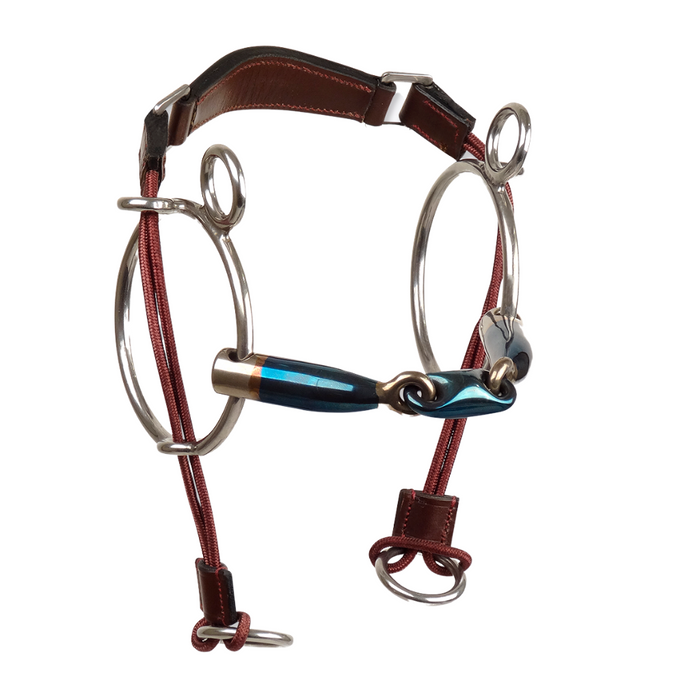 The Curbgag is a combination of the Pelham and the Loose ring Gag. A Curbgag is a loose ring with two small holes on each side for the leather curb strap to run through. The pressure points are on the chin and behind the ears. This cheekpiece can be used with one or two reins. It is most commonly used with two reins, one attached to the large ring and the other to the ring of the leather curb strap. This way, the rider can better control the pressure distribution between the curb and the mouth..
