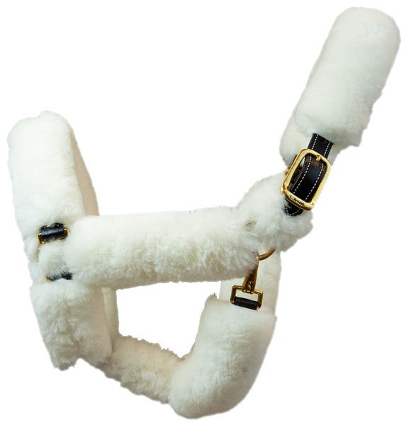 This genuine sheepskin halter is made using the highest quality Bright White sheepskin that is hand-sewn onto each of the Walsh 1" Havana double stitched halters.