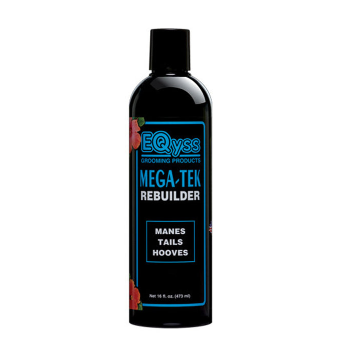EQyss Mega-Tek Rebuilder strengthens and repairs dry damaged coats, skin and cracked and brittle hooves. Mega-Tek binds protein to the skin and coat, returning elasticity and restoring strength. Excellent for use on bare spots such as blanket rubs, skin conditions, injuries, or bed sores. Helps restore hoof health. Strengthens soft hoof walls. Revitalizes quarter cracks & sand cracks. Massage into skin and coat or frog, sole, and hoof walls as needed. For all Horses Ponies Mares Foals. Tropical scent.