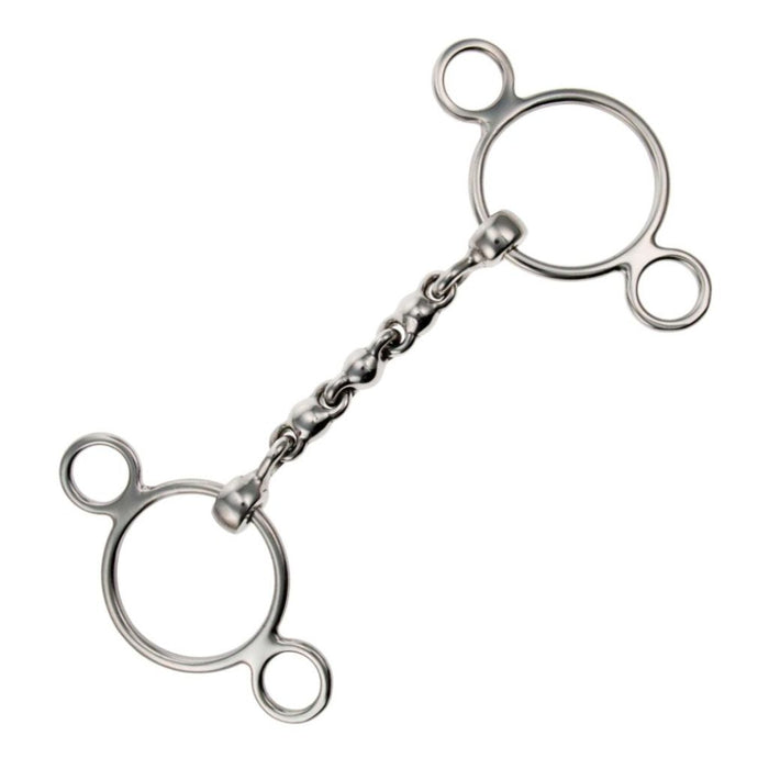 A mobile, multi-jointed mouthpiece that conforms to the shape of the mouth, the size of Waterford mouthpiece will usually be ¼” to ½” longer than the usual mouthpiece (except in the Pelham). The 3-Rng Cheek may be used with one or two reins, and a jowl, or jaw, strap may be added.