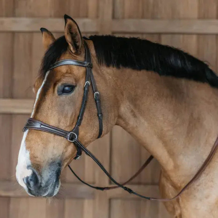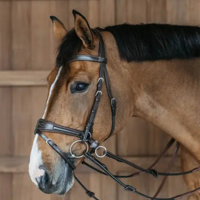The bridle has a removable flash ½’’ and includes two cross pull straps, which makes it adjustable to your needs and allows five different ways of using it. To optimize the field of vision for your horse, the cheekpieces are positioned below eye level.