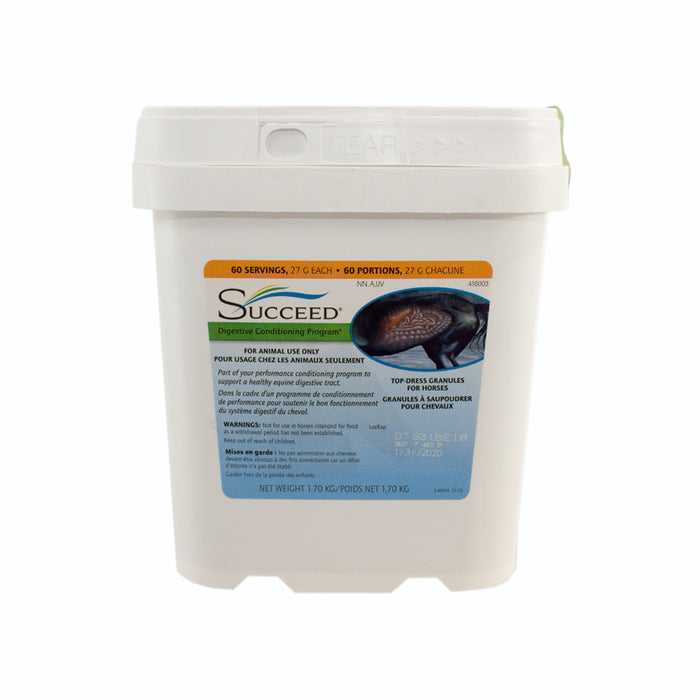 Succeed Digestive Conditioning Supplement for Horses will support your horse’s overall health and performance through digestive wellness. Succeed Digestive Conditioning Program delivers specialized nutrients that target healthy structure and function of the entire digestive system. Unlike other products that mask symptoms or only address one part of the digestive tract, Succeed supports the health of the entire digestive tract - including the stomach and the hindgut. Succeed is a proven option in the treatment and prevention of digestive tract ailments, including gastric and colonic ulcers. You'll see the results in healthier appearance, temperament, and performance. Succeed is also patented for increasing the colostrum immunoglobulin levels in mares. Any horse that is fed intermittently, on a high-grain diet, stalled, is breeding, or used for riding can benefit from the Succeed nutritional program. Top dress feed with 1 scoop Succeed granules twice daily during the first week of use; once daily thereafter.
